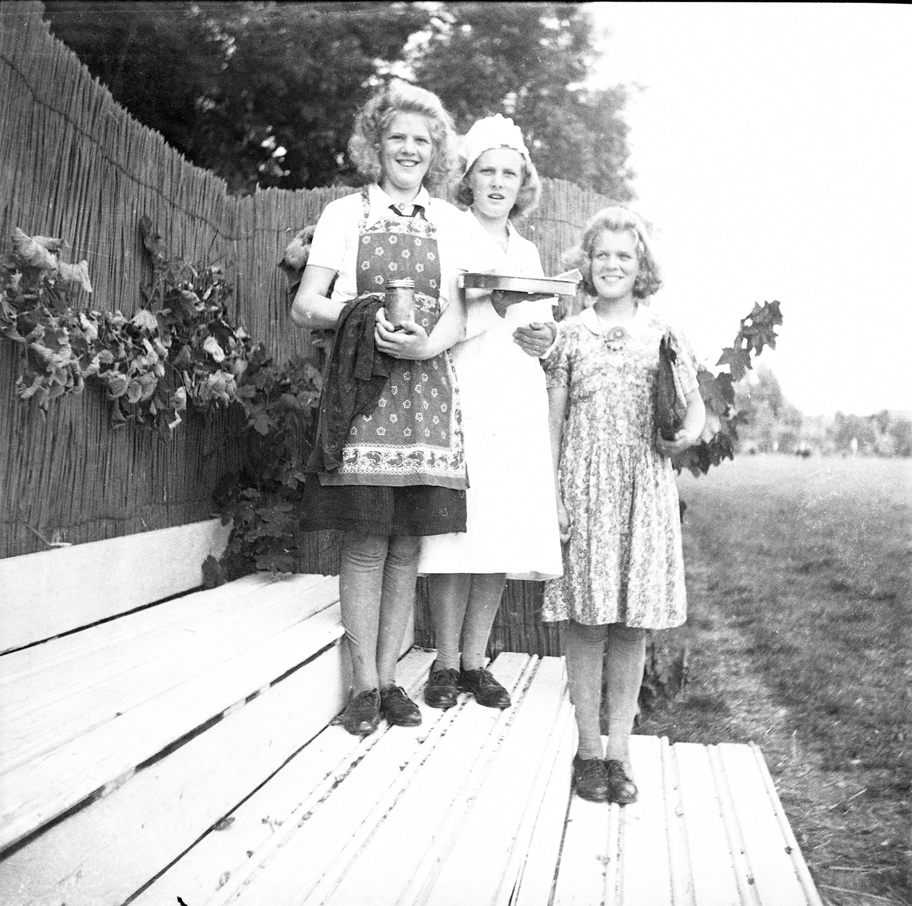 Truus Schrader, Lida van Vliet en Bep Schrader poseren met attributen voor de aanvang van het openluchtschouwspel, de Geheimen van de Heilige Mis.
