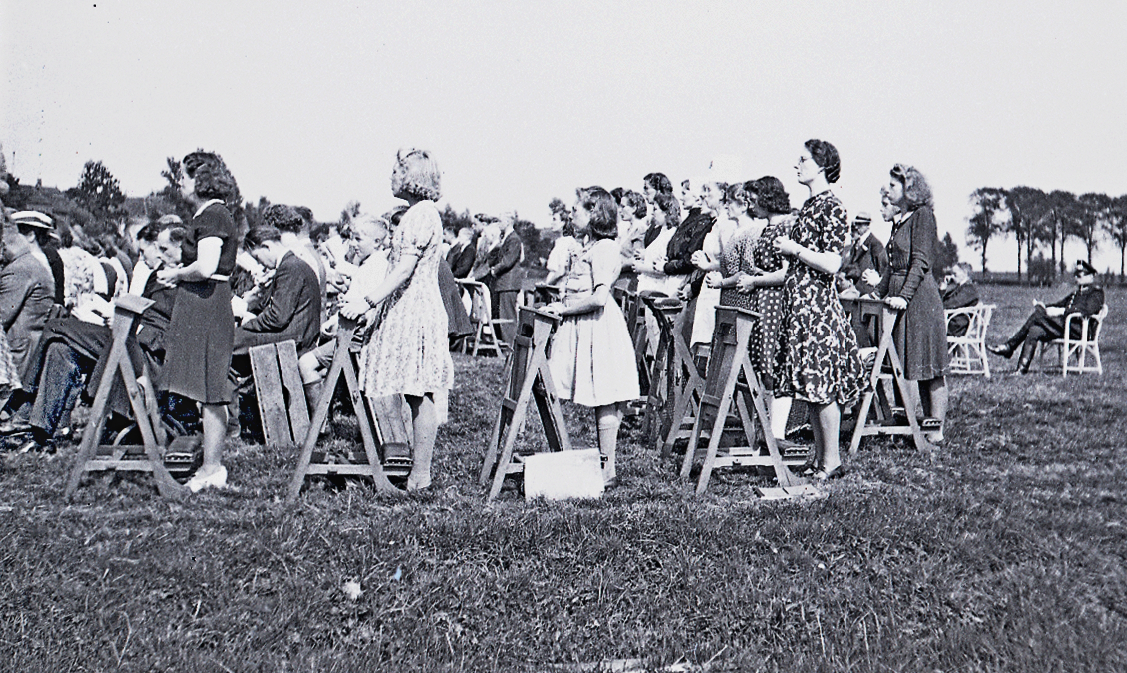 festiviteiten,kerk,pastorie,toneel, decor, bomen, weiland, klapstoel, openluchtvoorstelling, hoed, politie |