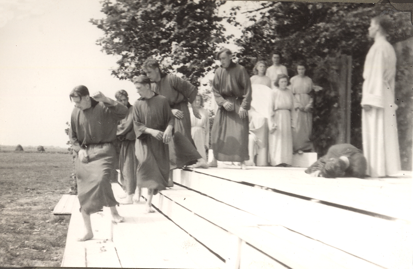 groepsfoto,festiviteiten,pastorie,polder,toneelspel, toneel. bomen,altaar, decor |