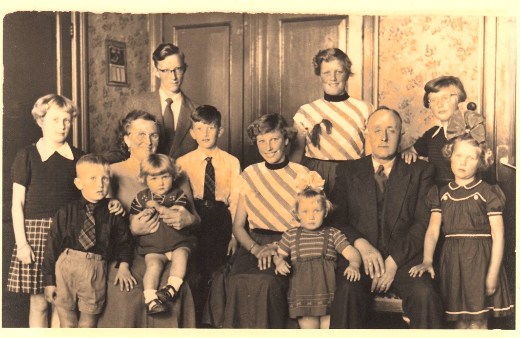 Een mooie familiefoto van het gezin van Theo Janson. Niet alleen Pa maar ook de jongens hebben stropdasjes om en twee van de meisjes hebben prachtige strikken in het haar. De jongste dochter Thea zit bij haar moeder op schoot. De foto is gemaakt in 1950.