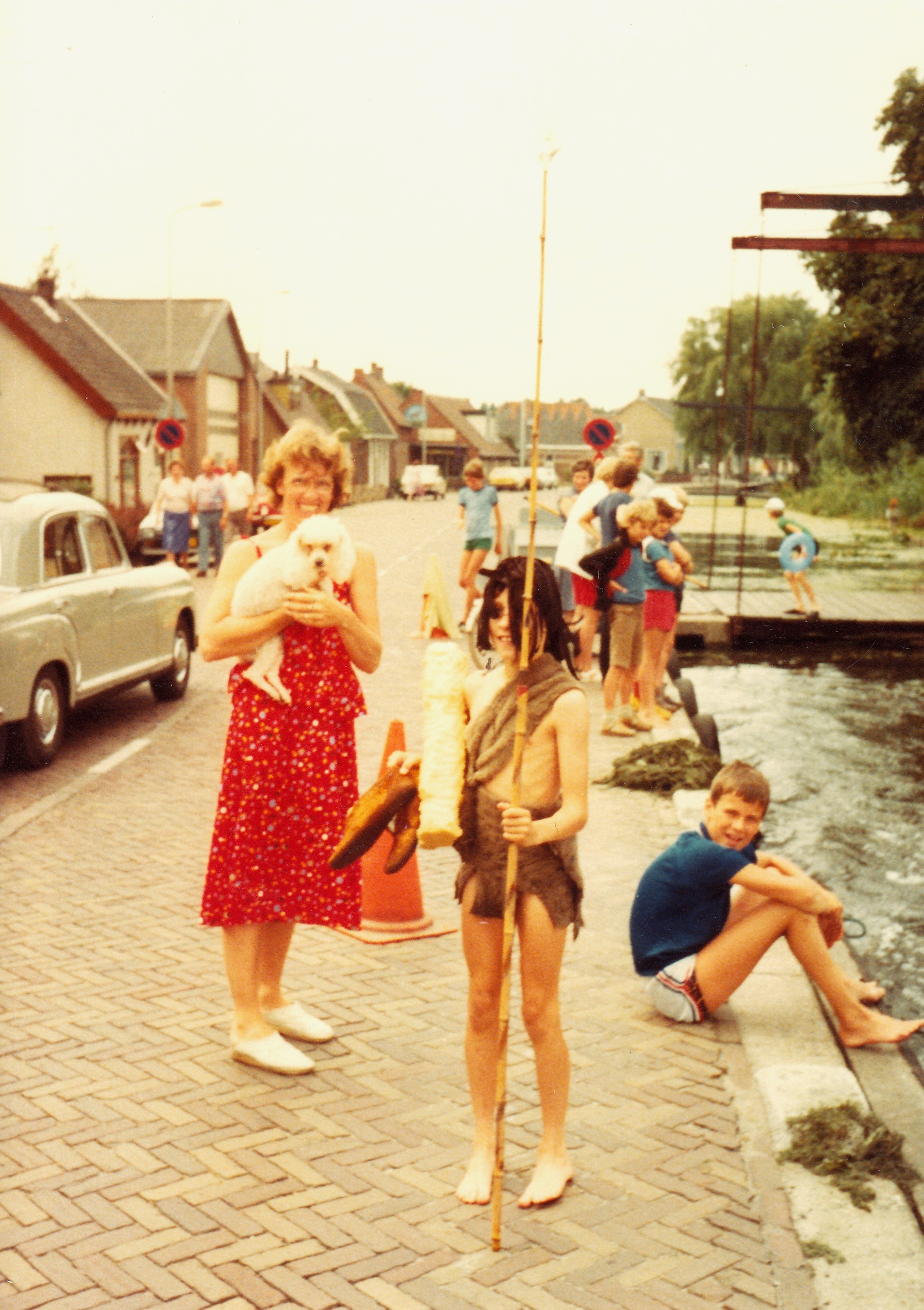 De watersportvereniging organiseerde altijd leuke evenementen en was zeer actief in de jaren 70 en 80. Hier zien we Peter Schrader als oermens. Zijn broer Paul kijkt toe vanaf de kant en heeft hem aangemoedigd, moeder Wil vindt het geweldig en laat zich overhalen om later zelf ook deel te nemen aan het ringsteken. Op de achtergrond staan diverse supporters en deelnemers.