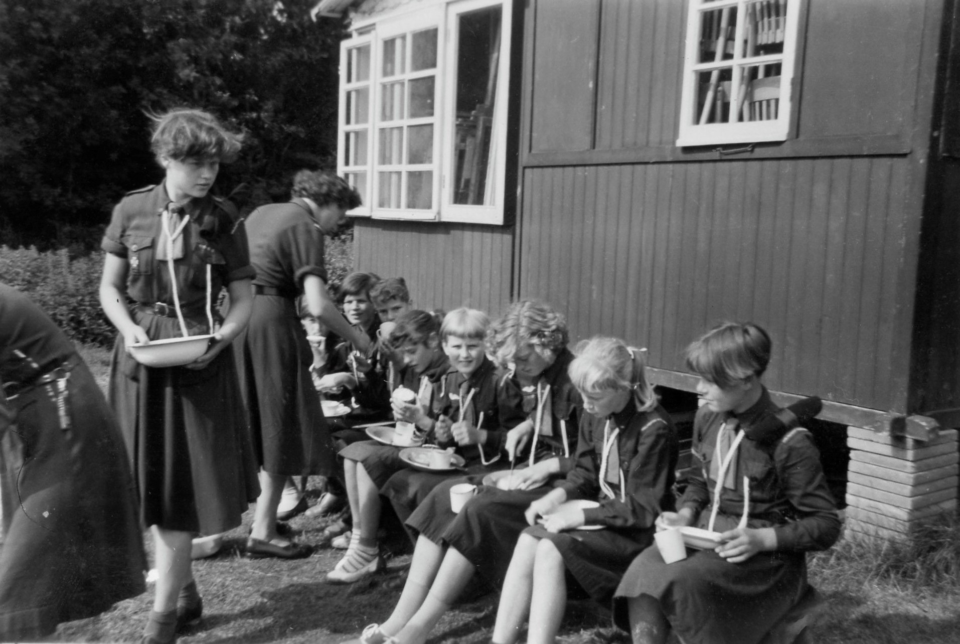Zelf eten koken voor de gidsen op een buitenvuurtje. De gidsen zitten met het bordje eten op schoot.